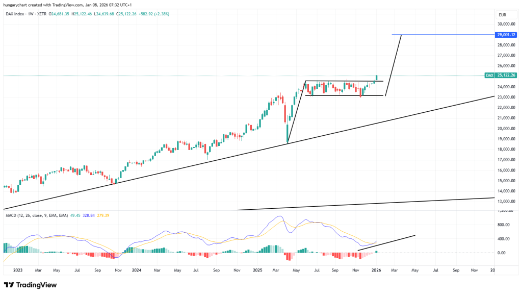 Ha egy kicsit kitágítjuk az időintervallumot, akkor egy zászló alakzatnak is nézhetjük. Ebből a célár 29.000 lenne. Ez elég vaskos emelkedés lenne innen. Az MACD is felfelé fordult, az emelkedést ez is erősíti.