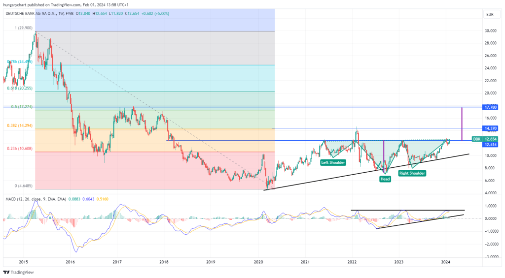Az MACD is ellenállást kóstogatja, a 4. alkalom általában sikeres szokott lenni. Ha sikeresen elhagyja a 12.50-12.80 zónát, a számított célár 17.70 körül van. Itt van a 2015 óta tartó esés 50 %-os fibója is, ez megerősíti ezt a megállót.