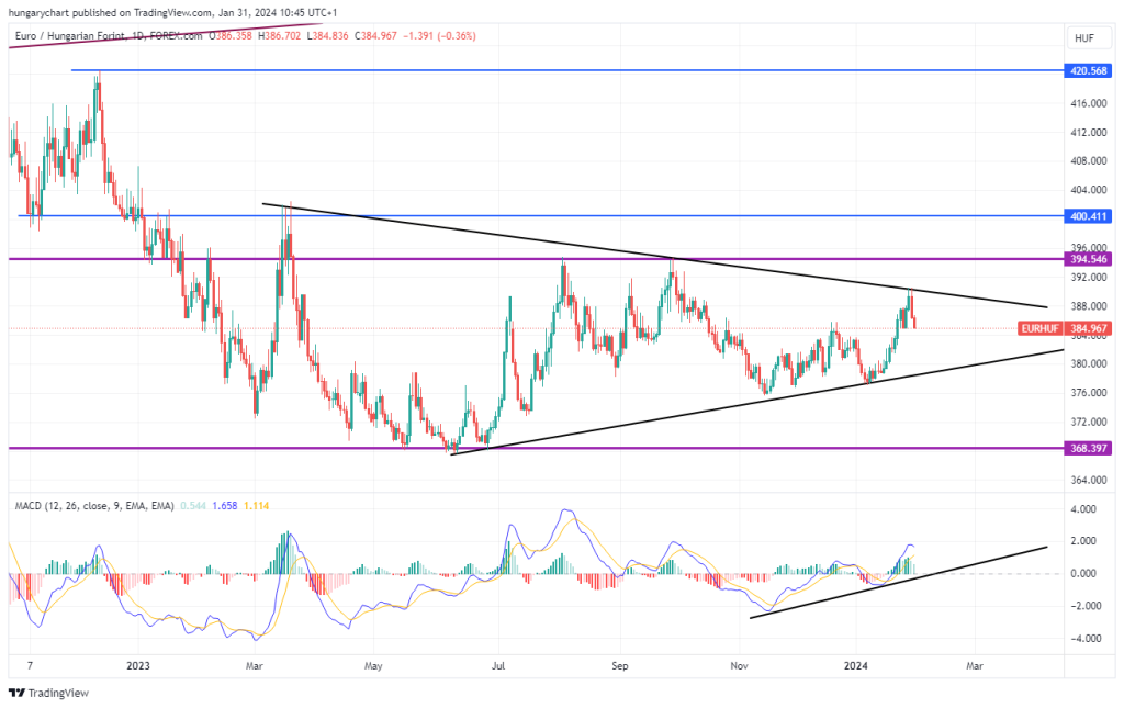 A fő kérdés, hogy merre törhet ki ebből a szűkülésből. Az MACD egy magasabb aljat csinált, onnan kezd felfelé fordulni. Ebből a felfelé irány tűnik valószínűbbnek.