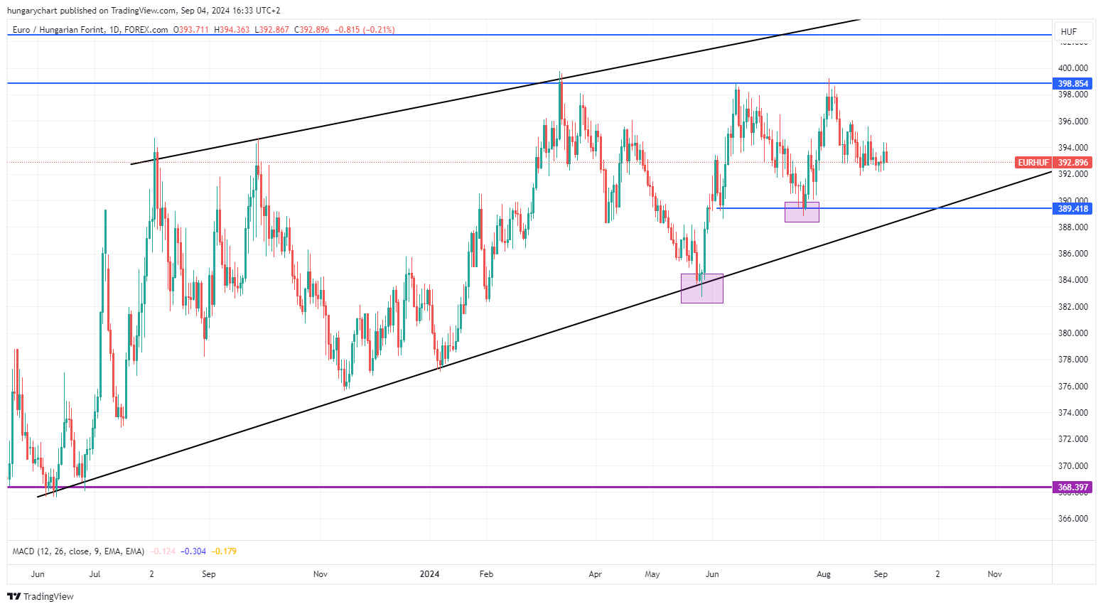 Egyelőre a 390-es alj a mérvadó. Ha ez alá tud zárni, akár törhet az emelkedő támasz is. Ebben az esetben 384 és 380 körüli árfolyam a következő támaszok.