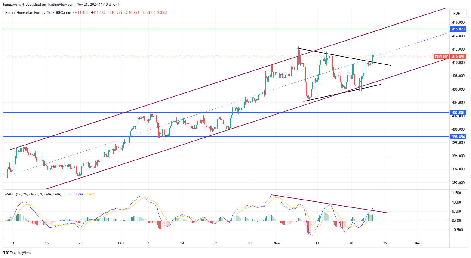 A következő ellenállás 415, ez jó eséllyel meglehet. Az MACD is támogatja az emelkedést. Egy csatornát is be tudunk rajzolni, nagyjából annak is ott lehet a teteje.
