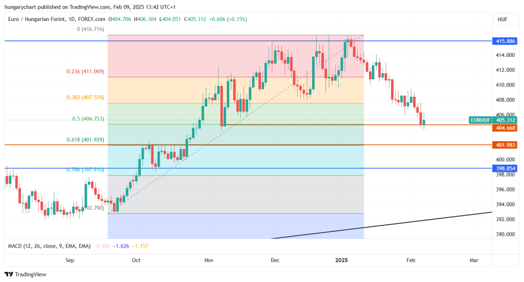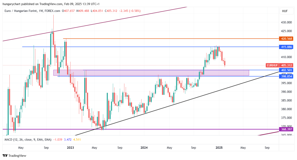 Jól látszik, hogy egy nagyon erős támaszzóna 399-402 között van. Tehát még pár forint akár lehet is lefelé, de e zóna alá nem várjuk. Nagy eséllyel mondhatjuk, hogy 400 alatt már nincs keresnivalója…
