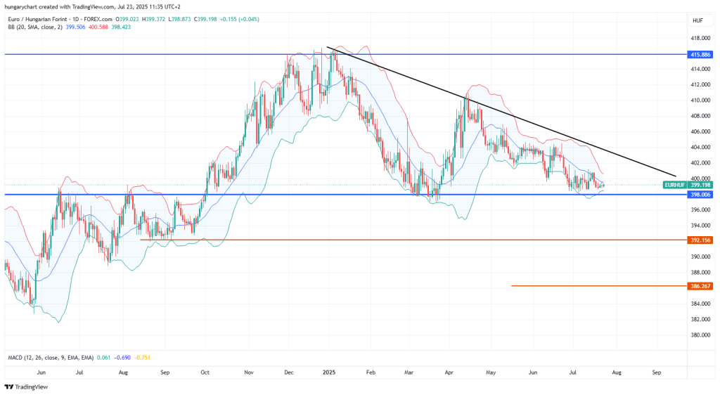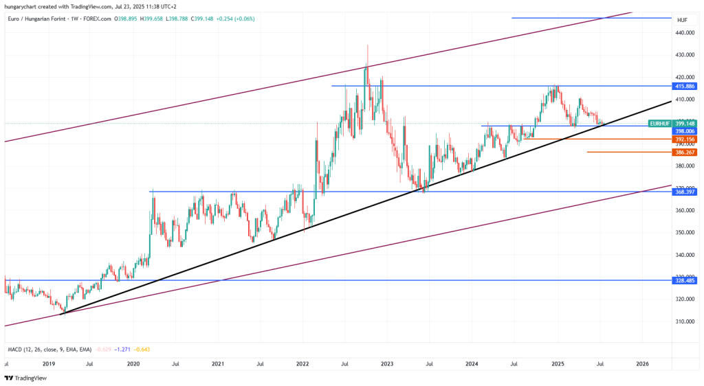 A 398-as szint erős támasz, ennek törése komoly jelzés lenne. Ebben az esetben 392 Ft lenne az első célár (de látszana 382-es ár is). Fundásan nem nagyon magyarázható, de rövidebb távon akár belefér egy „erős” forint…