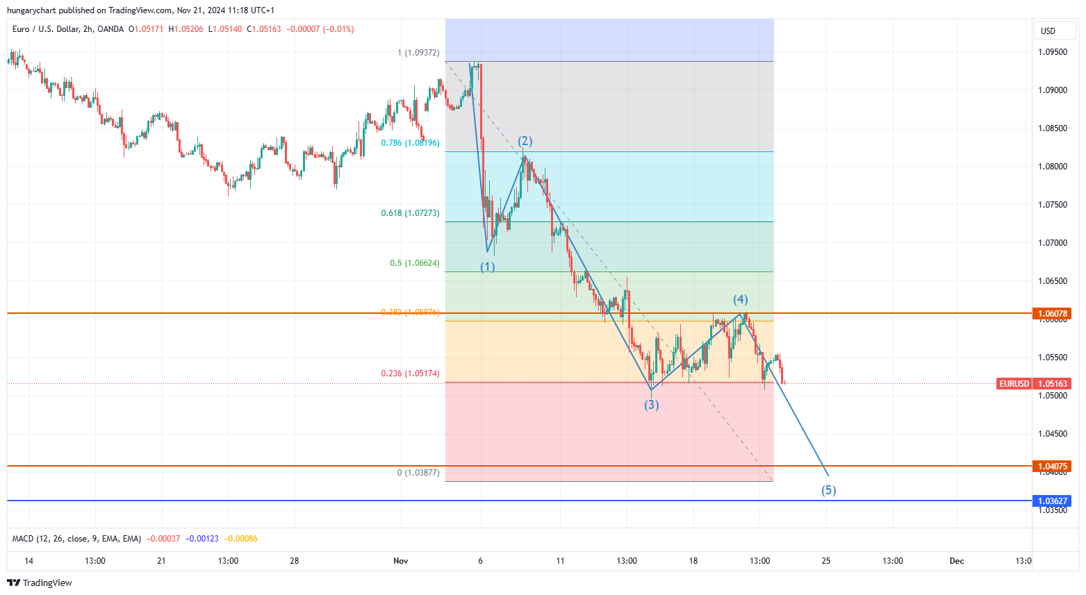 Rövid távú grafikonon egy öt hullámos esés rajzolódik ki. Ennek az utolsó hulláma következhet. A célár ebből 1.0380 körül van.