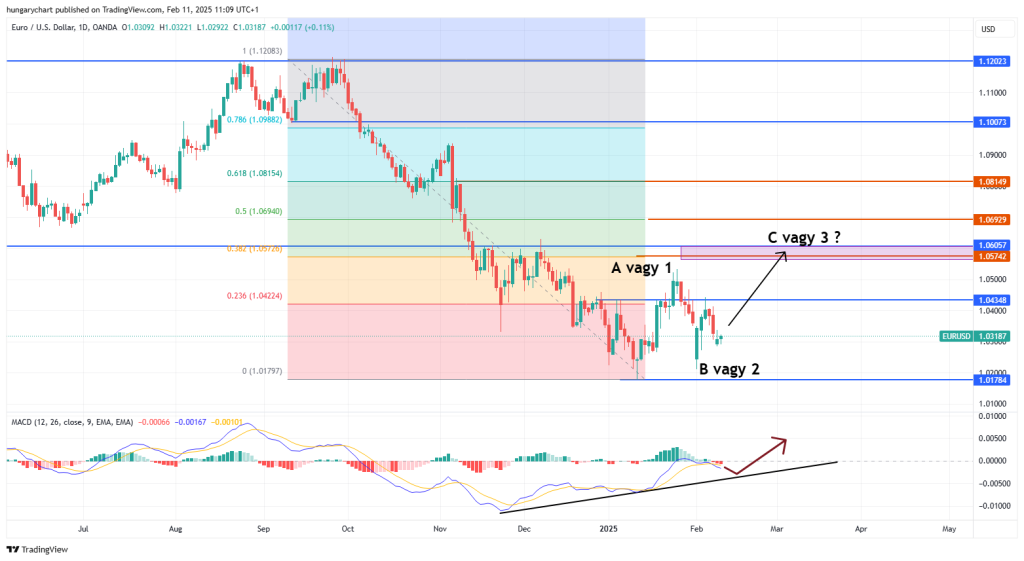 Eddig klasszikus visszatesztet csinált, ez lehet akár a B hullám alja is (de 2. hullámnak is beleillik). Ha „csak” egy C hullám jönne, annak is legalább az 1.0570-1.06 körüli zónáig kellene mennie (3. hullám esetén ennél feljebb, de ez később dől el). Ez az elsődleges célár.