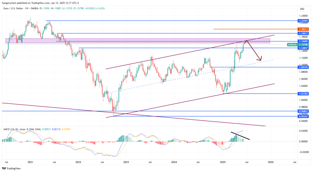 És van egy másik jól futó verzió. Esélyes, hogy egy nagy csatorna alakul ki, aminek a teteje szintén 1.17 körül lehet. Ha ez futna a jövőben, akkor a középvonalig is visszanézhet egy lokális csúcs után (de ez még odébb van). Az MACD már mutatja a gyengeséget, ez is megerősíti, hogy hamarosan fordulhat.