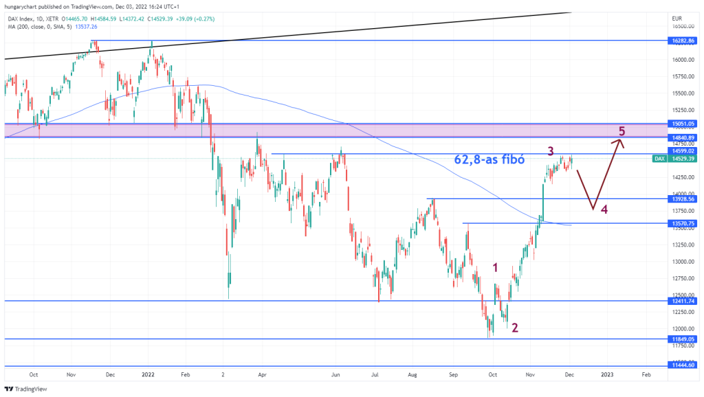Egy szép 3. hullám érhetett véget, Egy korrekció akár 13.600-ig is lenézhet úgy, hogy nem sérül a trend. Ráadásul ott van a 200 napos mozgó is. Ha fordul, elmehet a 14.800-15.200 betonellenállási zónáig.