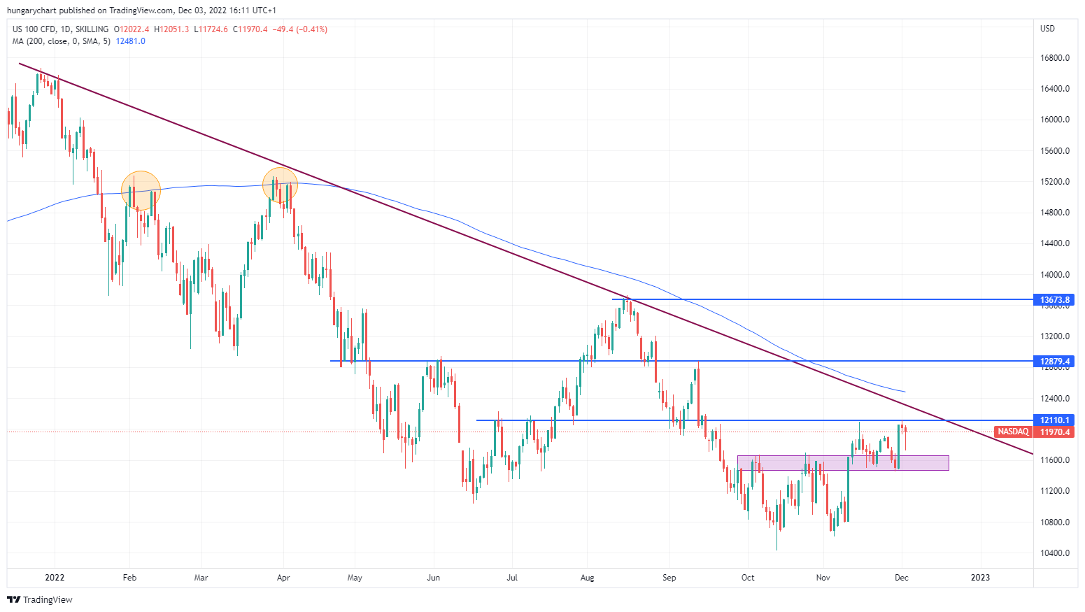 A 12.100-as ellenállás kétszer is megállította, ami fölött ráadásul az eső trendcsatorna és a 200 napos mozgóátlag is tornyosul. Utóbbi kétszer már megállította az emelkedést. Nehéz dió…