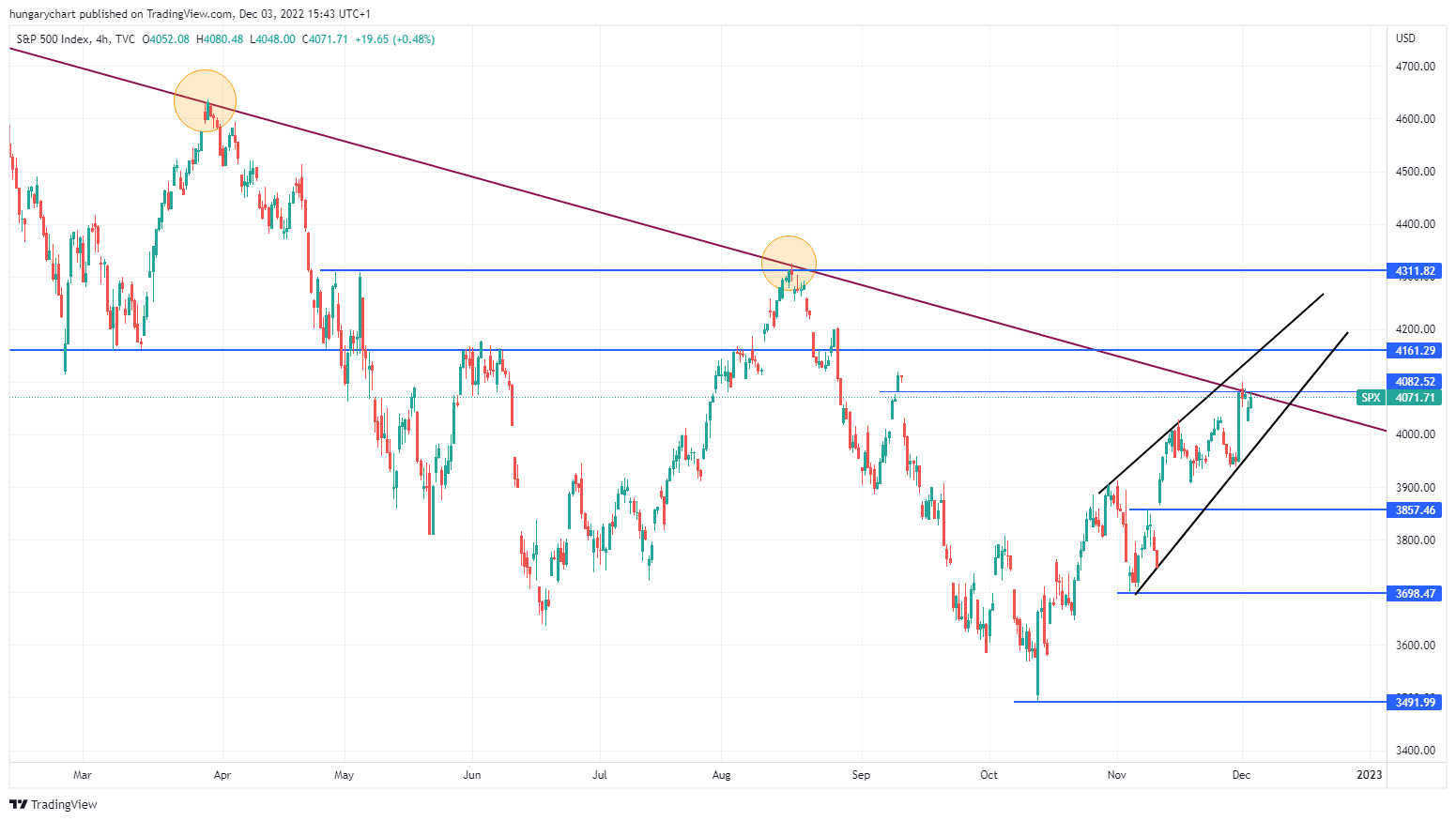 Az index elérte az eső trendcsatorna tetejét, amire most nagy esély van, hogy át is viszi. Felette azonban rögtön egy fibó ellenállási szint van 4.160 körül, ez a rövid távú célár. Ha netán lepattan a lila vonalról, a legközelebbi támasz 3.860 körül van.