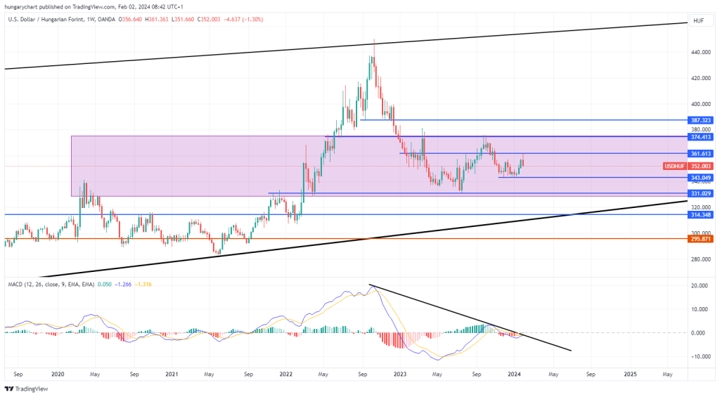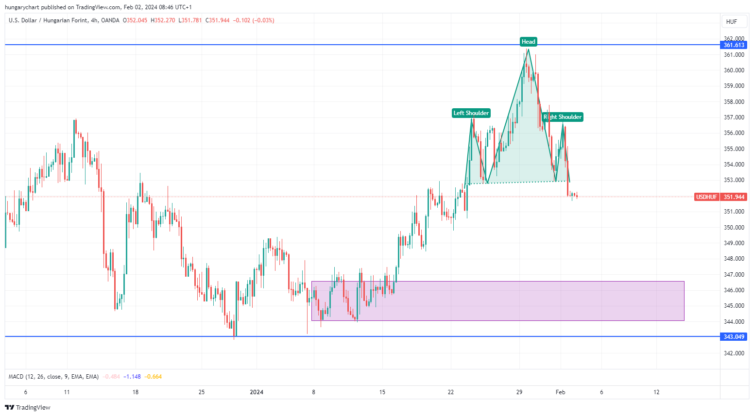 Beleláthatunk egy fej-vállat, amit ha visszatesztel alulról és lefordul, akkor validálódhat. Ebben az esetben 345 körül lehet a célár és a sávon belül marad így is.