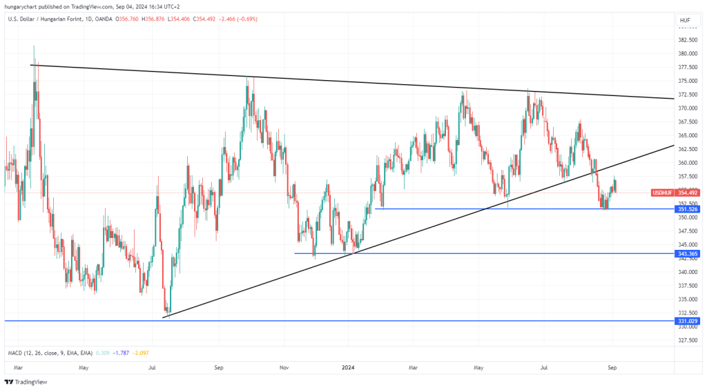 Mindehhez a 351-es támasznak kell törnie. Azalatt a 343 az erős támasz, majd a lokális mélypont, 331.