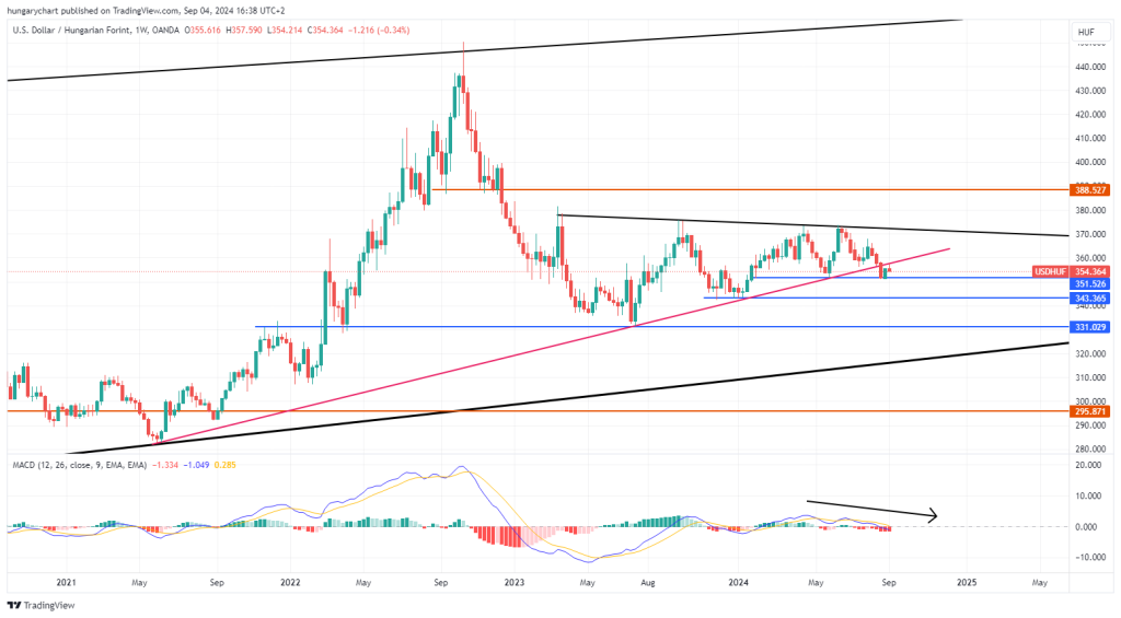Itt még jobban látszik, hogy egy több éves támasz tört le – hacsak nem fals letörés, de eddig nem így néz ki. Az MACD is folyamatosan esik, ez megerősíti a lefelé mozgást.