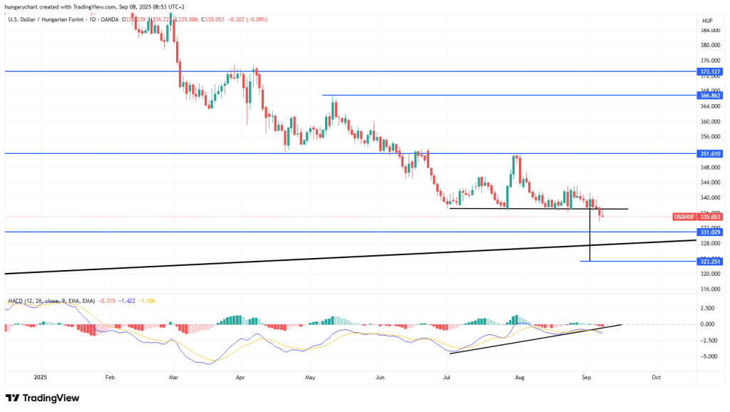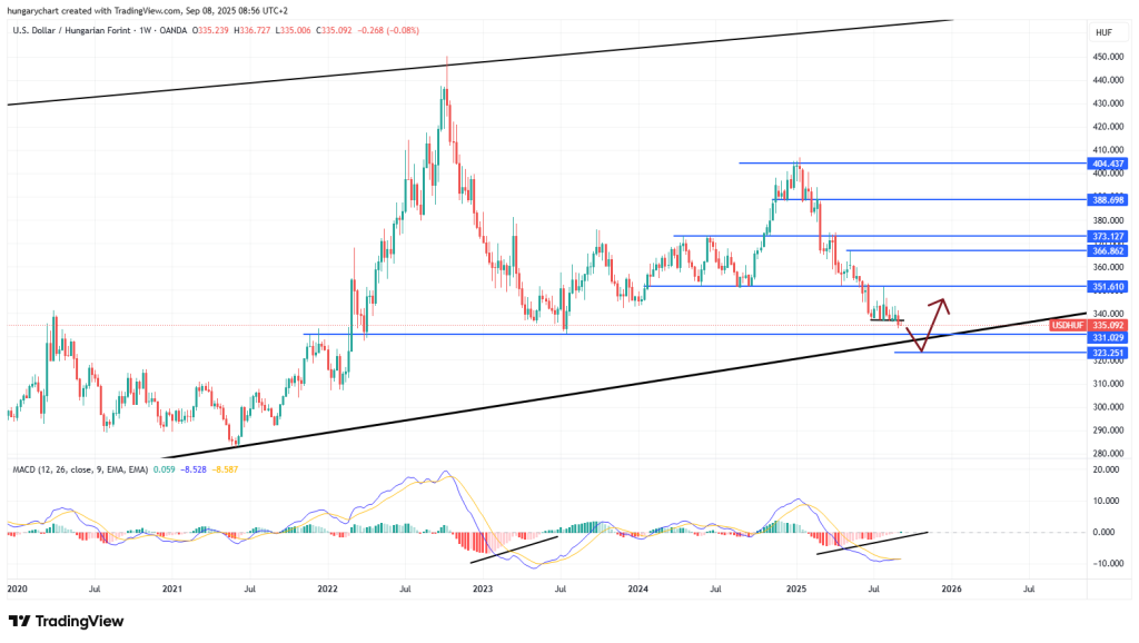 Ezzel alámenne a 18 éves trendvonalnak, így onnan egy gyors visszapattanásra számítok 330 fölé. Az MACD is már divergens, így nagy eséllyel az utolsó lefelé impulzus következik.