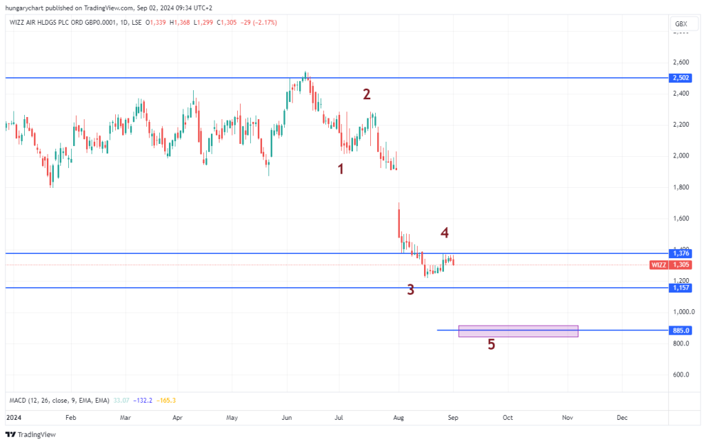 Egy öt hullámos esés kezd kirajzolódni, aminek az 5. hulláma következhet. Ez több számítási módszer alapján is 900 körüli célárat mutat. Ott lenne vége a teljes esésnek és indulhatna egy nagyobb korrekció.