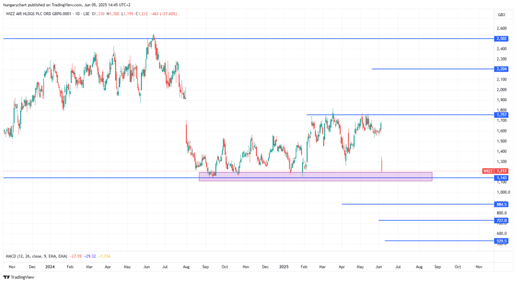 Naposban látszik jól, hogy a sáv alja (ha lemegy odáig) kritikus lesz. Ez a hatalmas rés nagyon vészjósló. Ha törik az 1135-ös szint, akkor a következő támasz 900 körül van. Ám letörés ideális korrekciója 730 körül van…